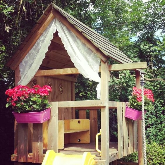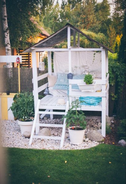 Díszítsük virágokkal, szalagokkal, lampionokkal, bátran használjunk erős, élénk színeket…tuti ez lesz az a hely ahol nem leszünk egyedül, mert mindenki ott fog ücsörögni a kis házban:)
