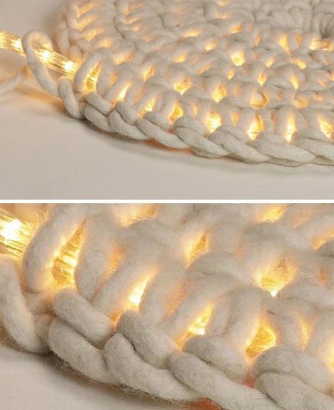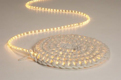 Mivel most van teli minden üzlet a karácsonyi fényfüzérekkel, biztosan nem lesz gond beszerezni a fénycsövet, ami az alapja a szőnyegnek. Utánna már csak a fonal kell- vastag-, vagy a megunt pólóinkat is felhasználhatjuk ha felcsíkozzuk és összekötözzük. És egy kis minimális horgolni tudás. És már készülhet is a csodás és különleges világító szőnyegünk.